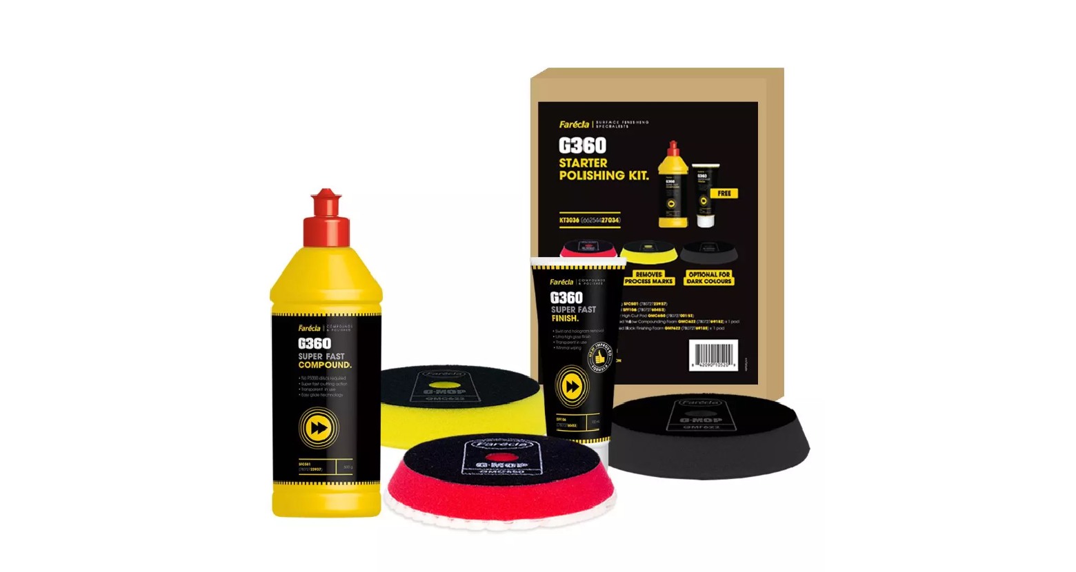 Zestaw Startowy G360 (KT3036) od Farécla oferuje próbne ilości wszystkich kluczowych elementów systemu polerskiego w jednym łatwym do zamówienia numerze części. Zawartość to 500g butelka G360 Pasta W Płynie Super Fast i 100ml tubka G360 Emulsja Wykończeniowa Super Fast, oferowane z jednym z każdego z trzech 6-calowych padów w systemie: G Mop Superścierna Grubo Cięta Podkładka Polerska, która umożliwia szybkie cięcie od P1500, i następująca G Mop Trapezoidalna Pianka Polerska do użycia z tym samym środkiem, aby szybko usunąć wszelkie ślady procesu z pierwszego etapu. Opcjonalny etap wykończenia dla czerni i ciemnych kolorów jest pokryty przez G Mop Czarna Trapezoidalna Pianka Wykończeniowa w połączeniu z G360 Emulsja Wykończeniowa Super Fast.