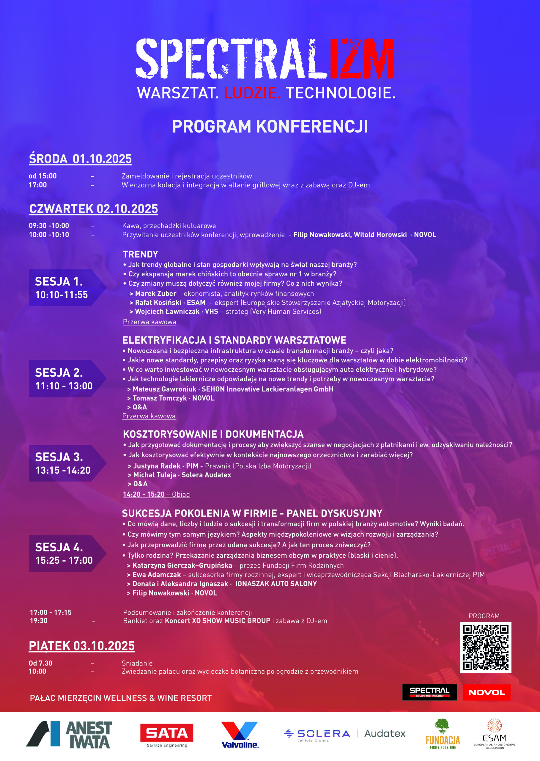 Merytoryczna konferencja branżowa SPECTRALIZM jest jedną z najbardziej prestiżowych i unikalnych konferencji branży lakierniczej w Polsce. Jako firma NOVOL, producent marki systemu lakierniczego SPECTRAL już 4-ty raz będziemy gościć na niej właścicieli i menedżerów warsztatów blacharsko-lakierniczych, ekspertów branżowych, praktyków oraz Partnerów.